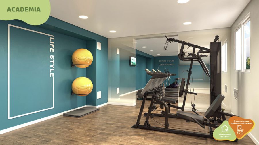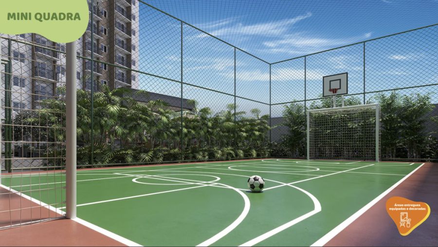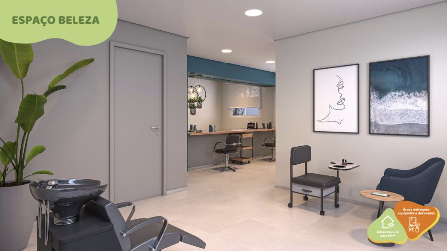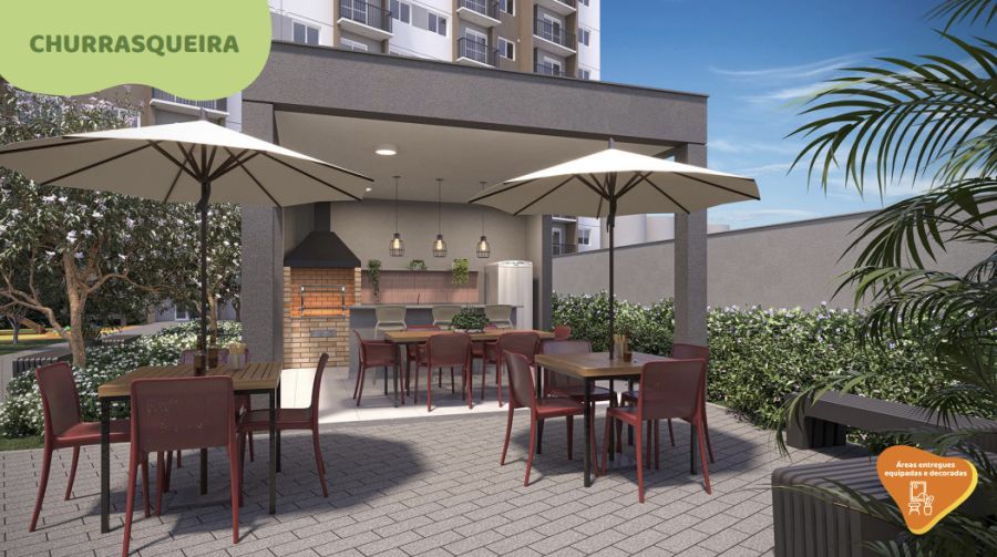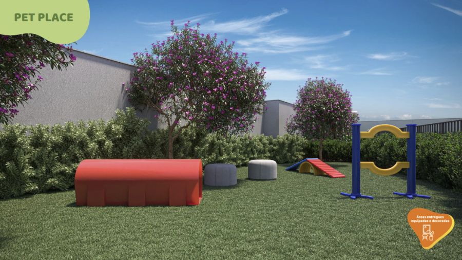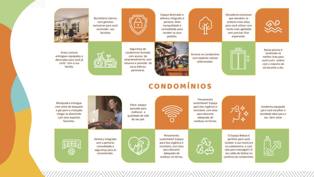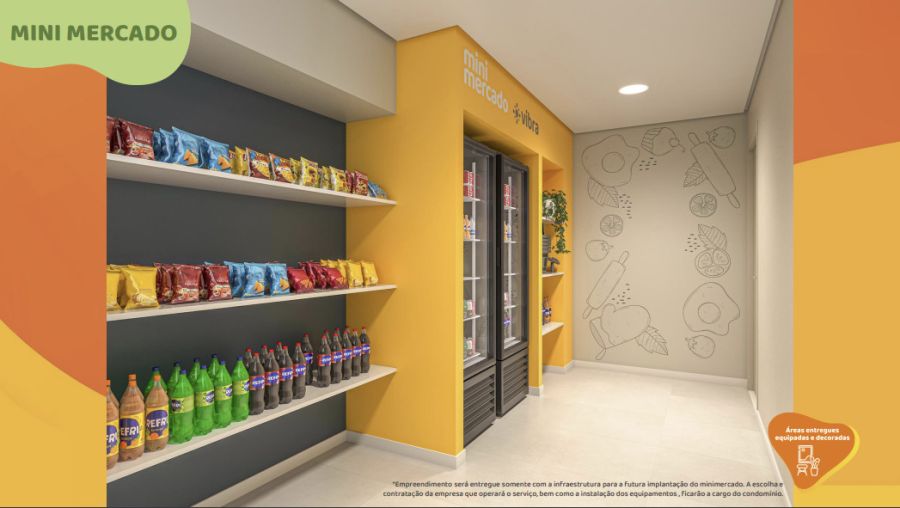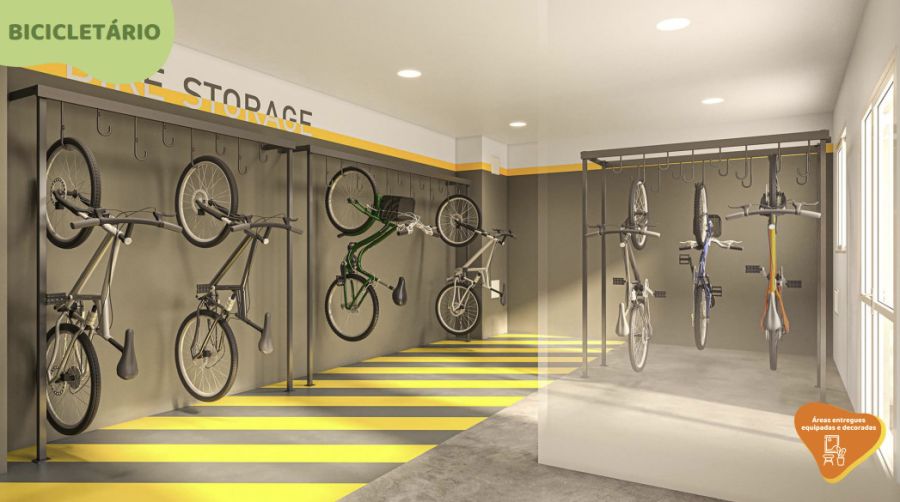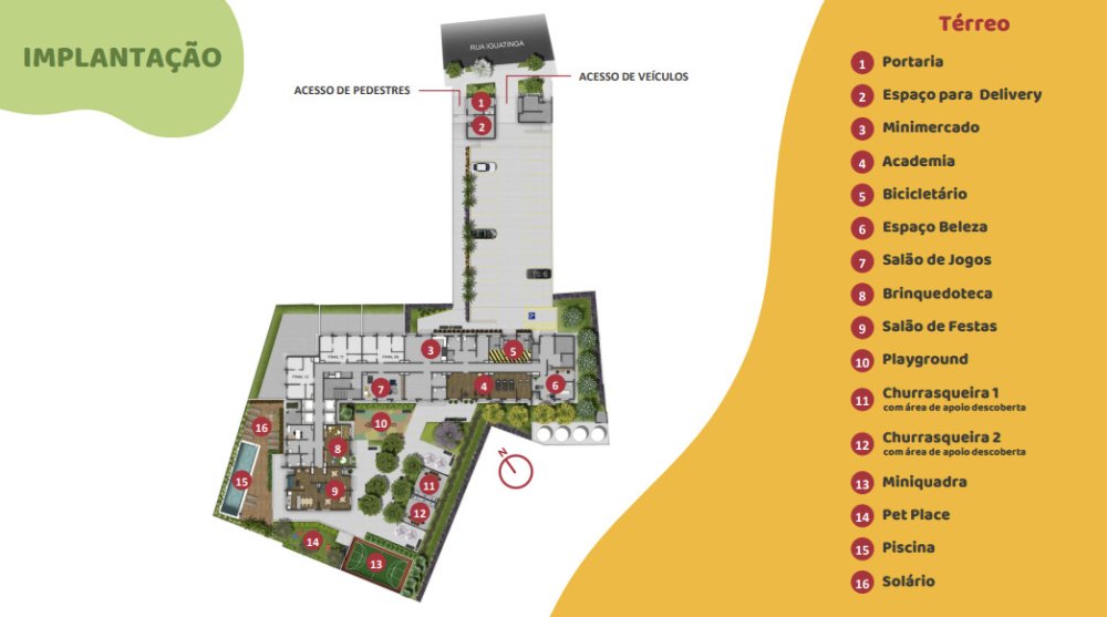 Itens de lazer: 1 Portaria; 2 Espaço para Delivery; 3 Minimercado; 4 Academia; 5 Bicicletário; 6 Espaço Beleza; 7 Salão de Jogos; 8 Brinquedoteca; 9 Salão de Festas; 10 Playground;