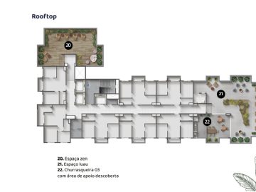 Térreo 3. Minimercado 4. Fitness 5. Salão de jogos 6. Brinquedoteca 7. Salão de festas 1 8. Salão de festas 2 9. Gourmet/ Coworking 10. Pet care 11. Piscina adulto 12. Piscina infantil 13. Solário 14. Chute a gol 15. Playground 16. Churrasqueira 1 17. Churrasqueira 2 18. Pet place 19. Espaço beleza